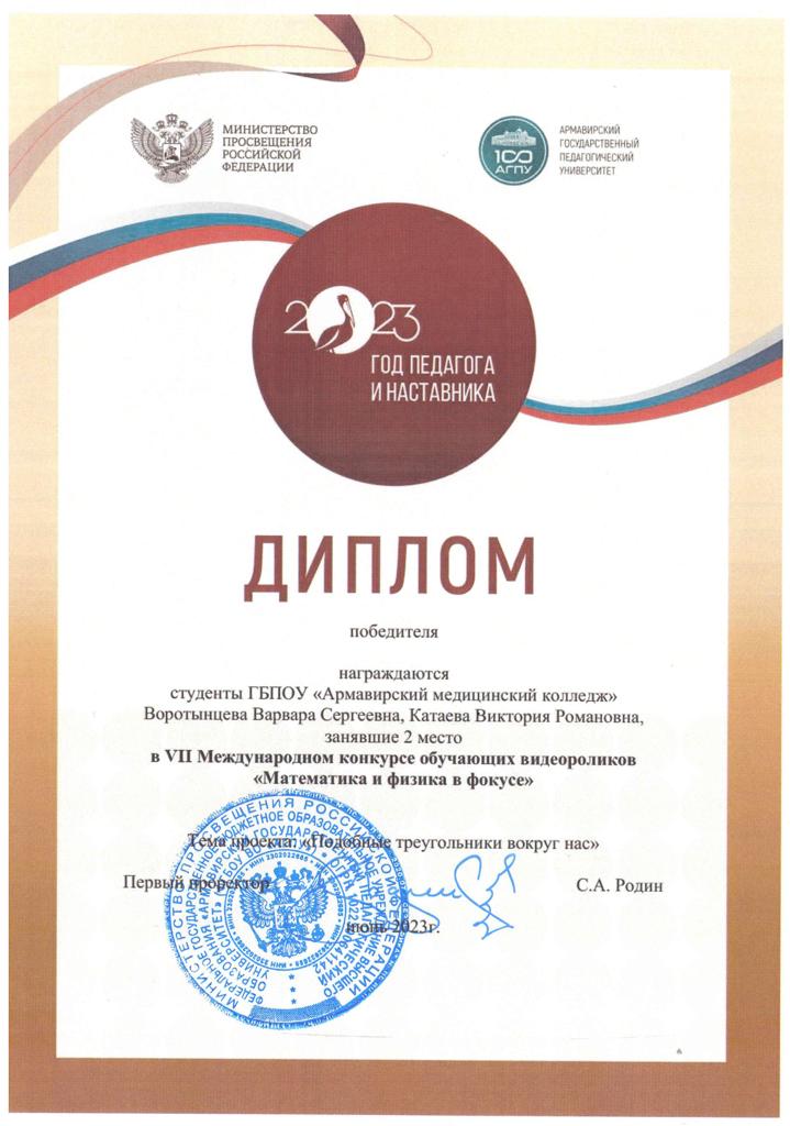 2.2. Участие обучающихся в региональных олимпиадах, конкурсах, соревнованиях, определяемых нормативными документами отраслевых министерств Краснодарского края и других региональных органов исполнительной и законодательной власти, ОО высшего образования; | Диплом |