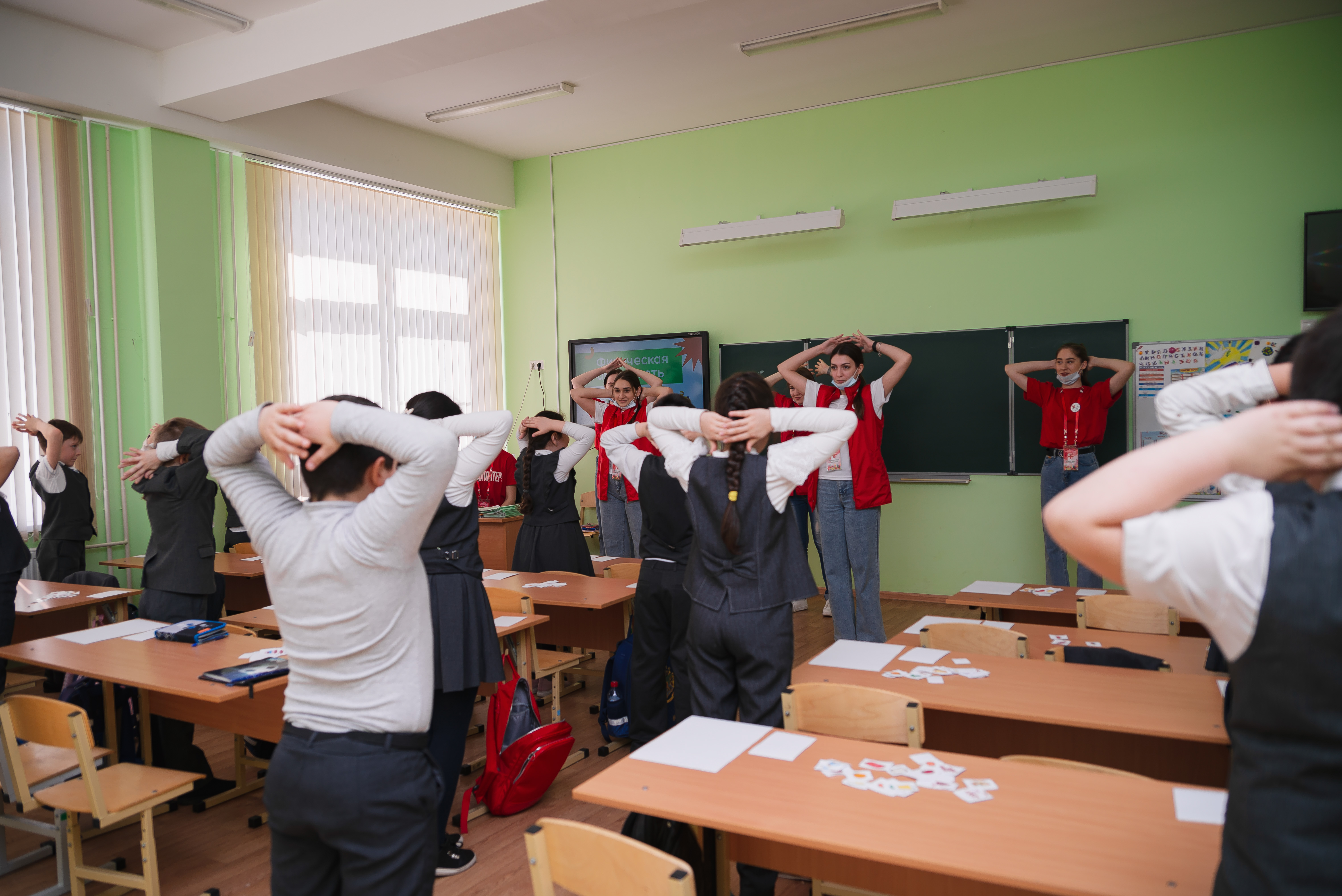 Мероприятие направлено на просвещение школьников по ключевым аспектам здорового образа жизни. Урок состоял из 6 блоков. В начале урока волонтерами была проведена зарядка под энергичную музыку.